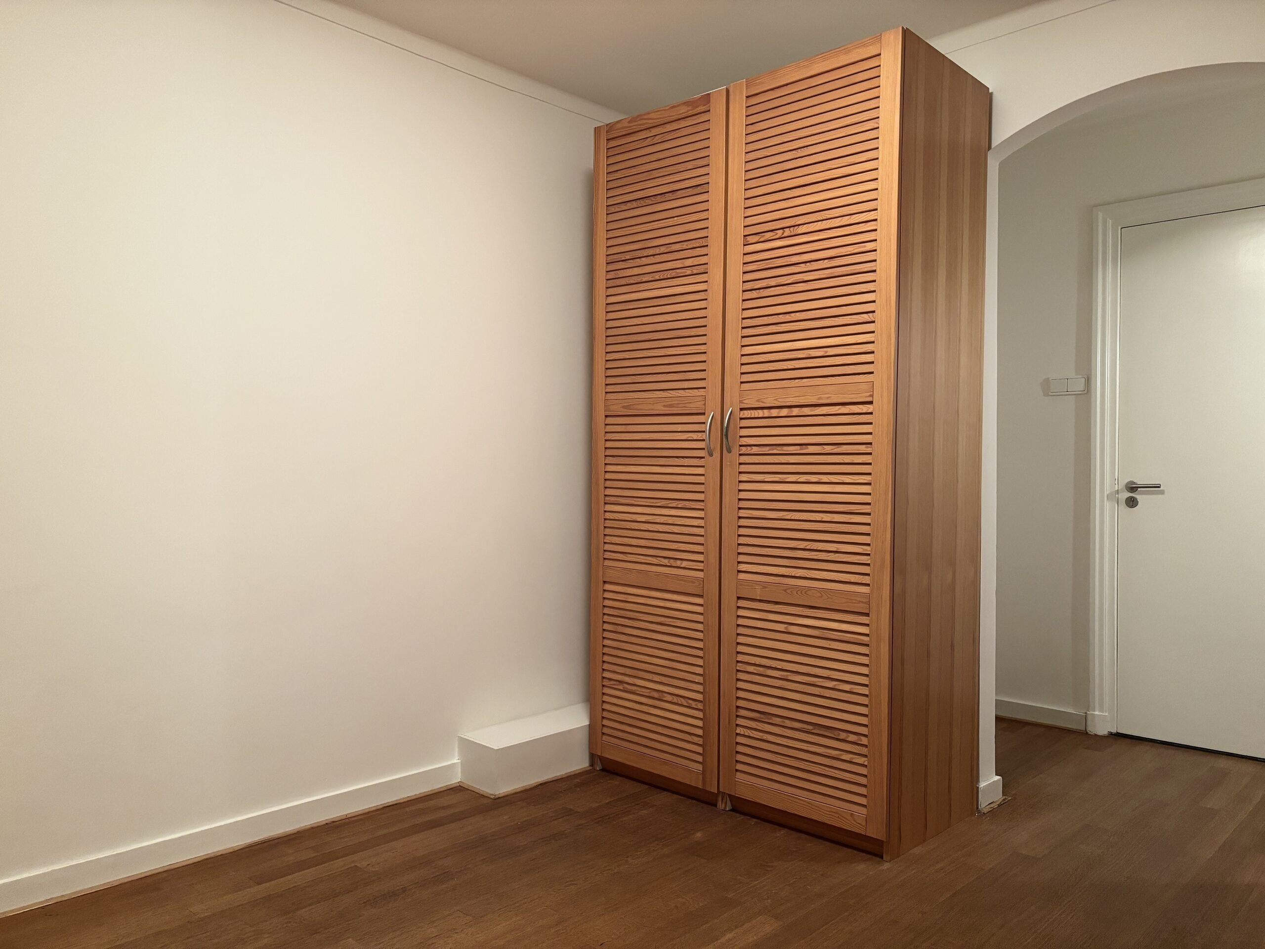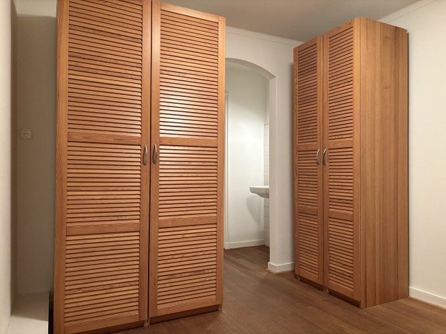 Twee ruime slaapkamers met inbouwkasten en wastafel.