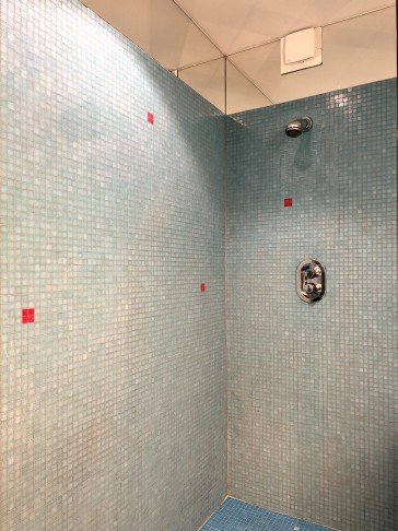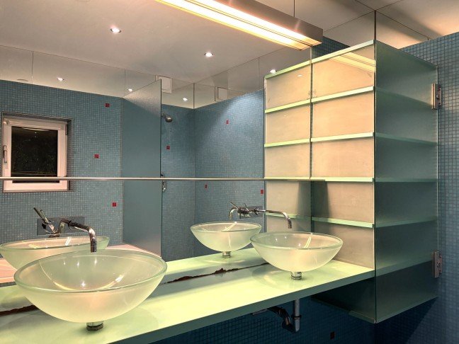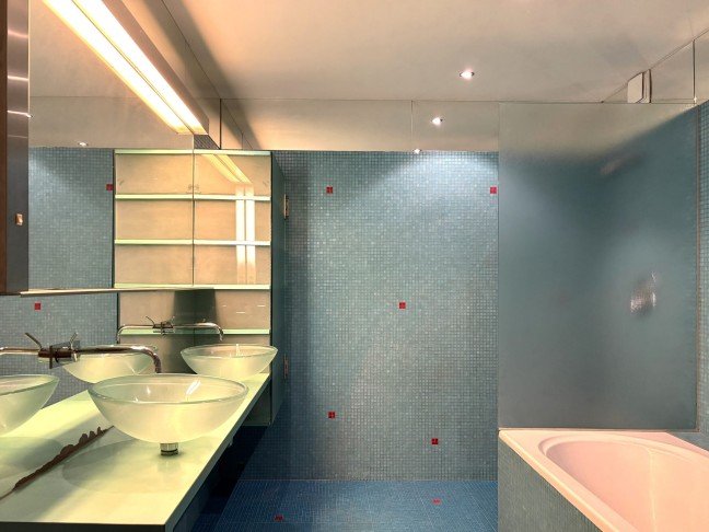 Zeer ruime badkamer met een dubbele wasbak, toilet, ligbad en inloopdouche.