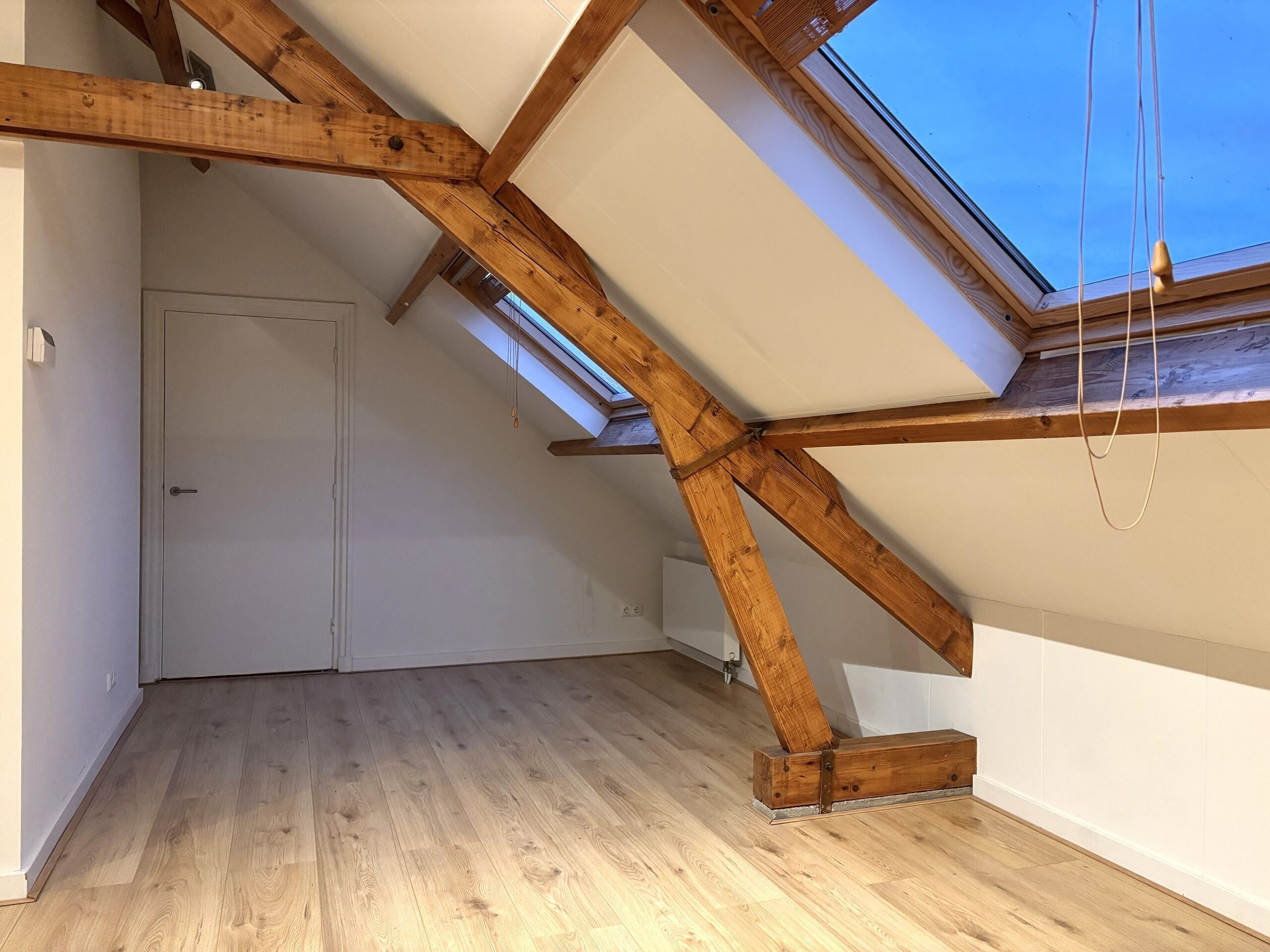 Woonkamer L-vormige woonkamer met velux dakramen.
