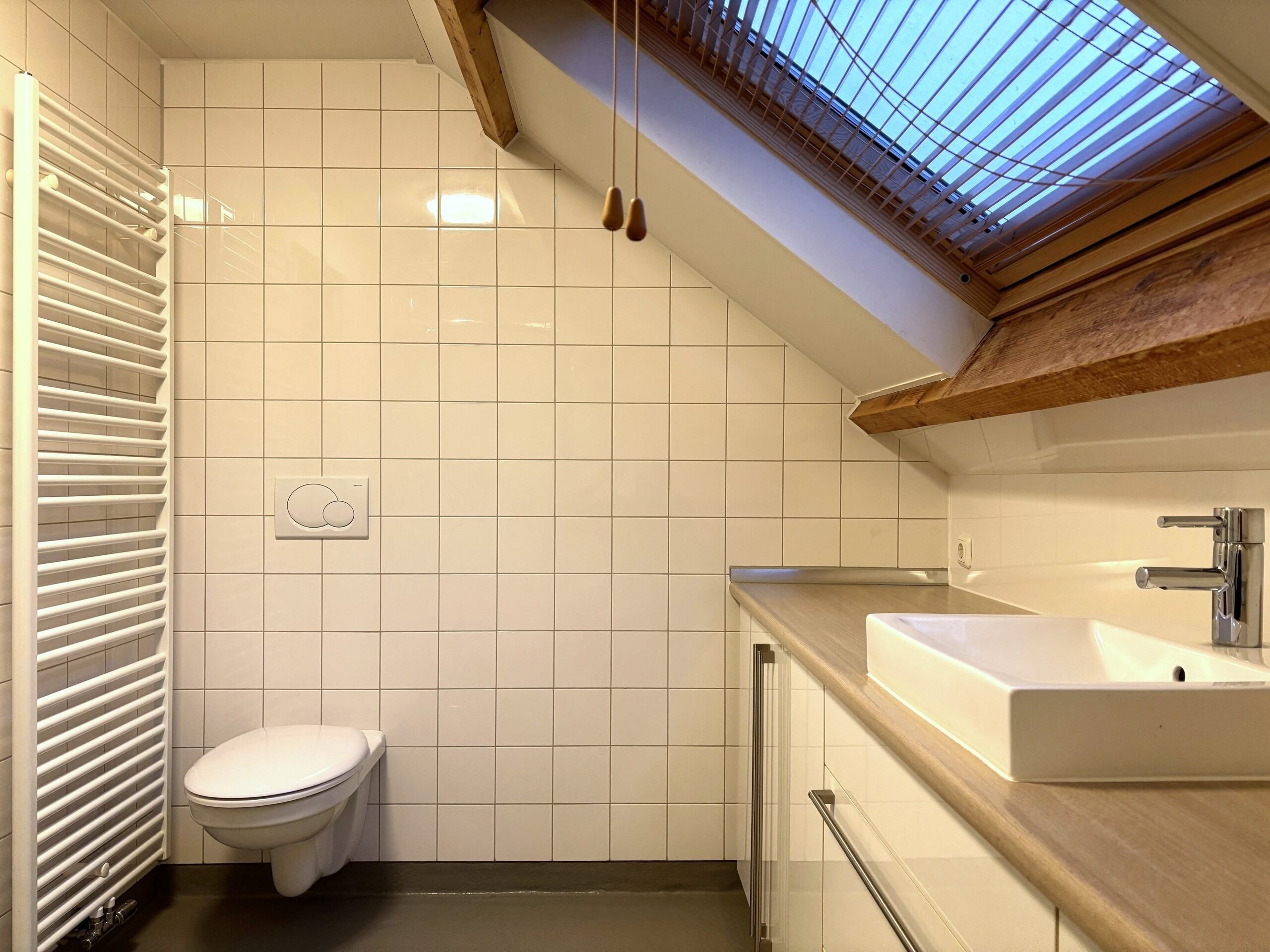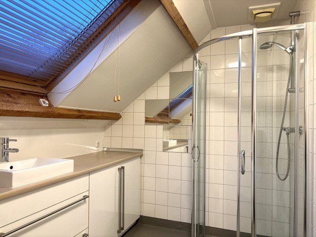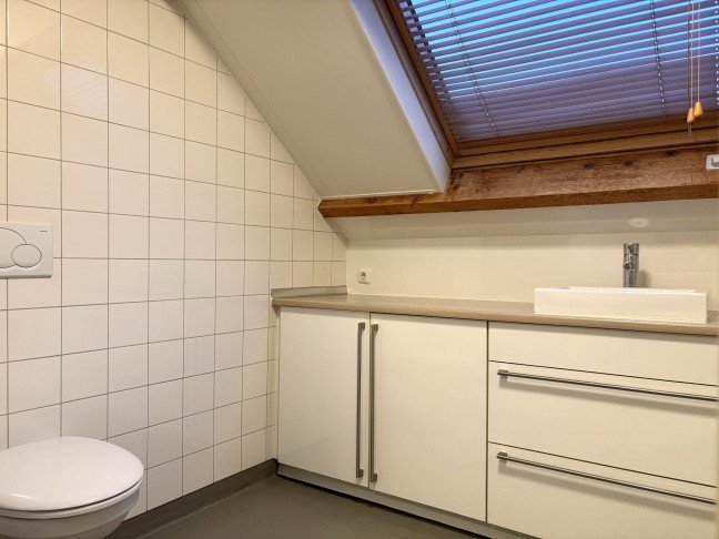 Zeer ruime badkamer met wasbak, toilet en douche.