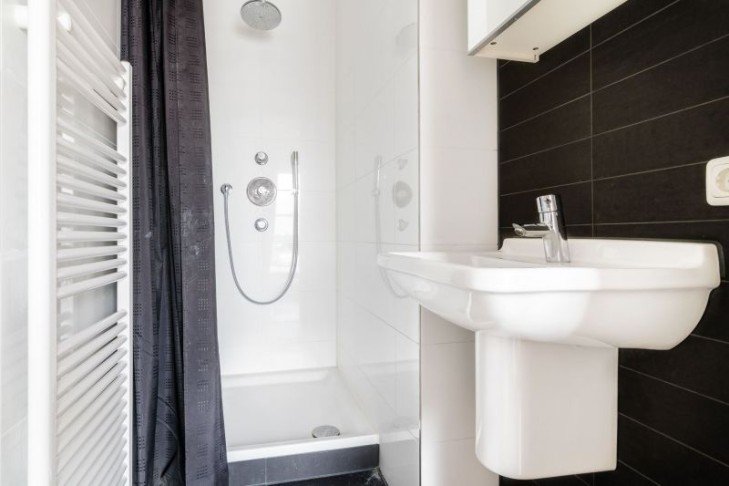 - Geheel betegelde badkamer met douche, voorzien van regendouche met thermostatische kraan, wastafel en spiegelkast met verlichting