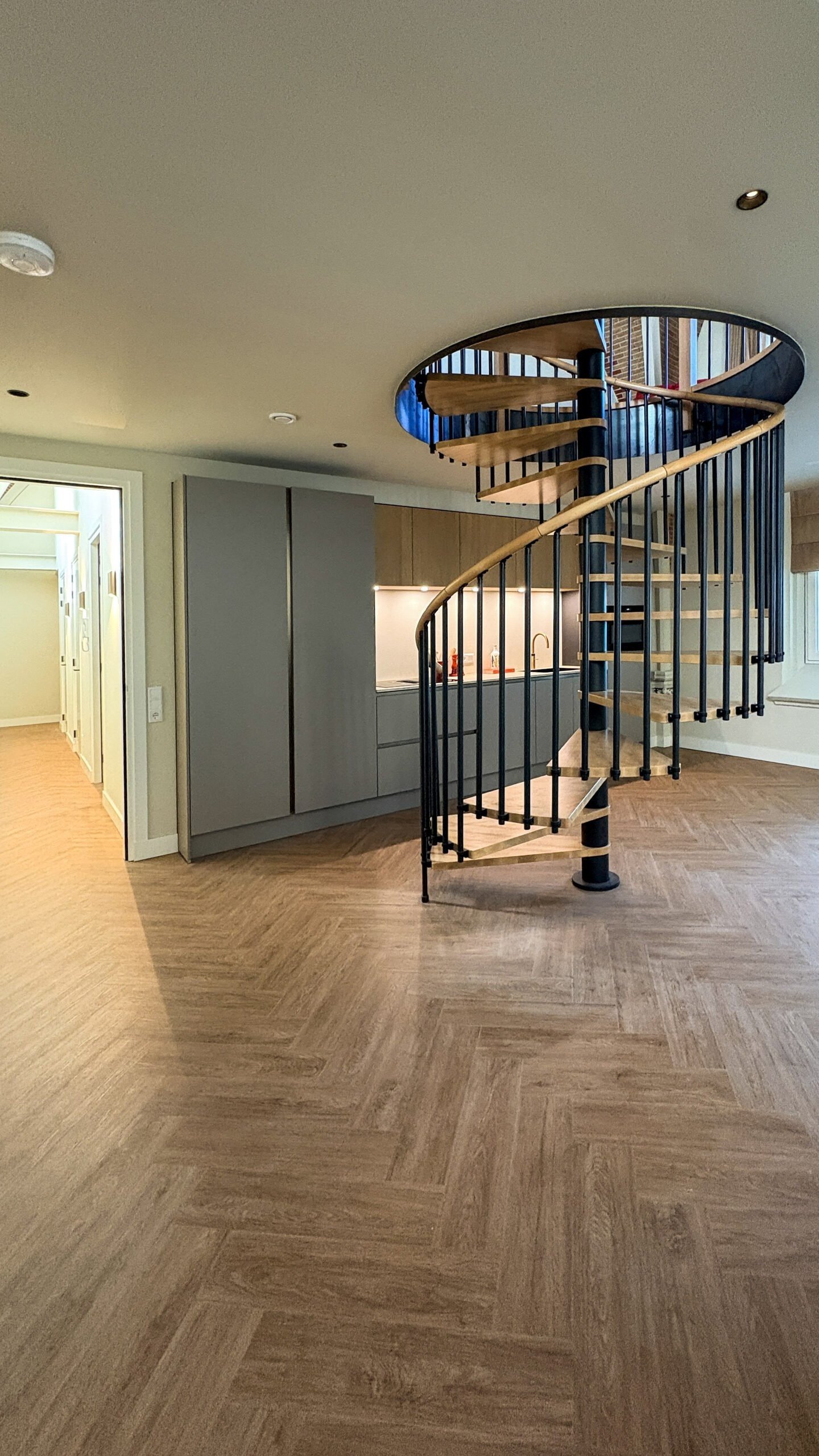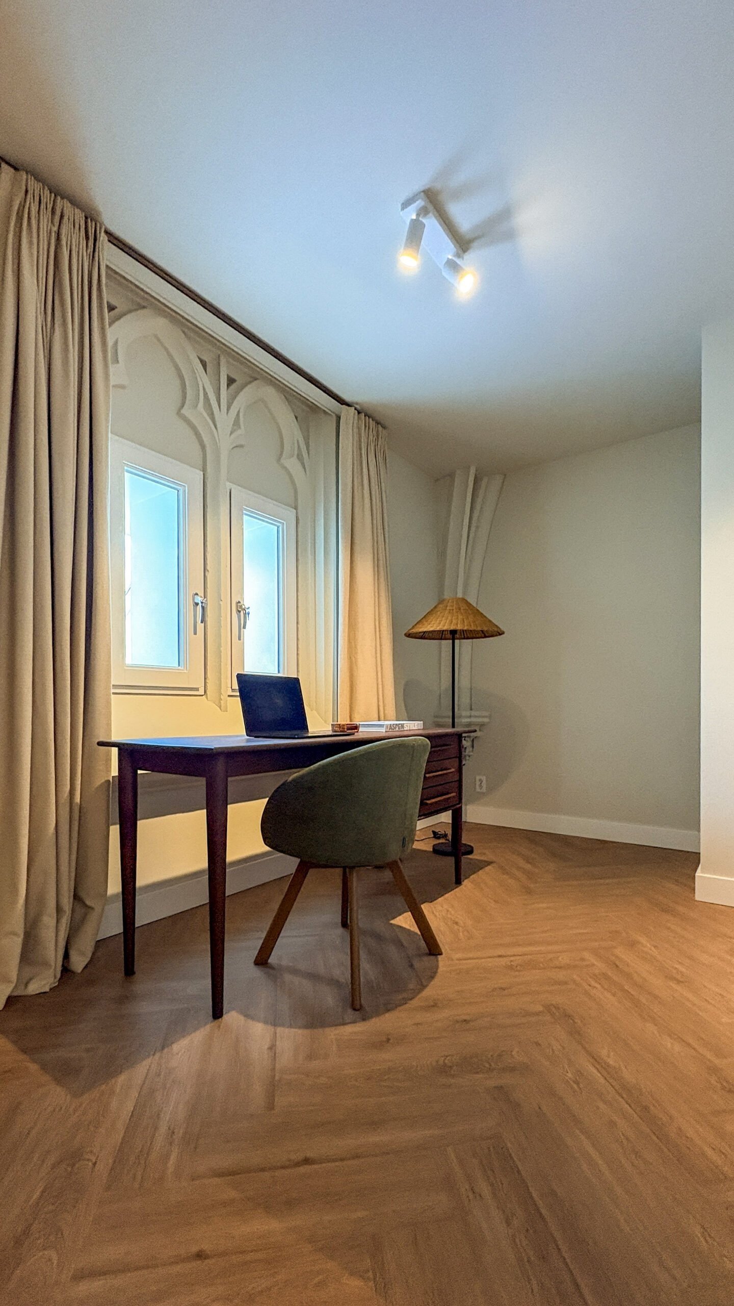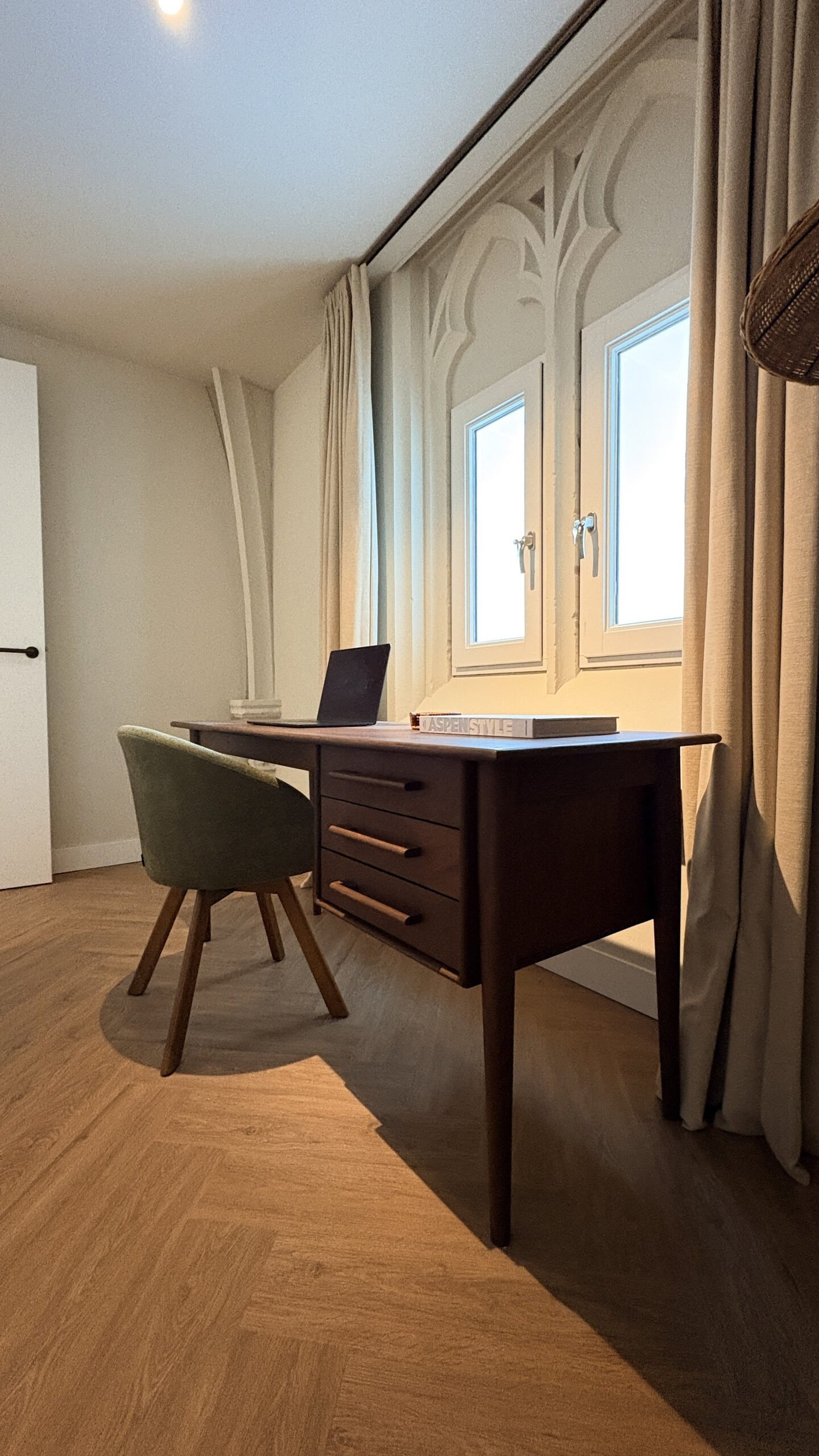 Het penthouse is volledig gemeubileerd en tot in detail ingericht door een binnenhuisarchitect. Meubels, verlichting, materialen en kleuren zijn zorgvuldig op elkaar afgestemd, wat resulteert in een stijlvol en warm geheel. Alles is aanwezig – van comfortabele zitmeubels tot eettafels, bedden en accessoires. Design, comfort en historie komen hier naadloos samen. Het doordachte lichtplan laat het interieur zowel overdag als ’s avonds optimaal tot zijn recht komen, terwijl de visgraat PVC-vloer zorgt voor een rustige en luxe basis.