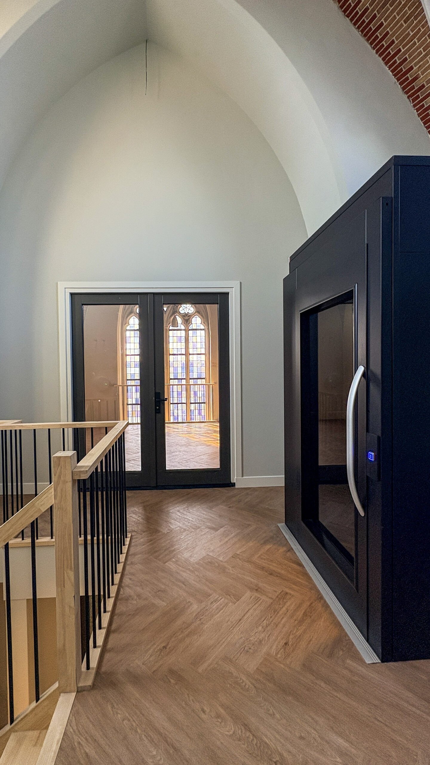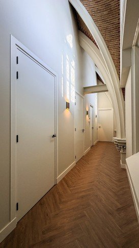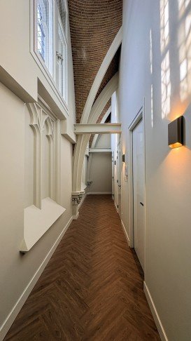 Via de centrale entree bereik je het penthouse eenvoudig per lift of trap. Bij binnenkomst valt direct de indrukwekkende ruimtebeleving op. De hoogte van de voormalige kerk, de karakteristieke bogen en de bijzondere raampartijen creëren een bijna kathedraalachtige sfeer.