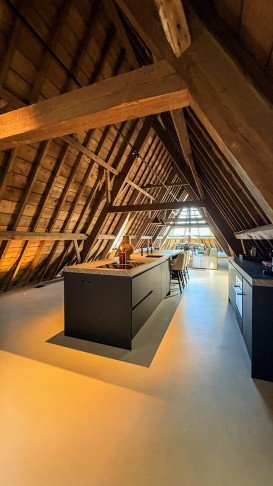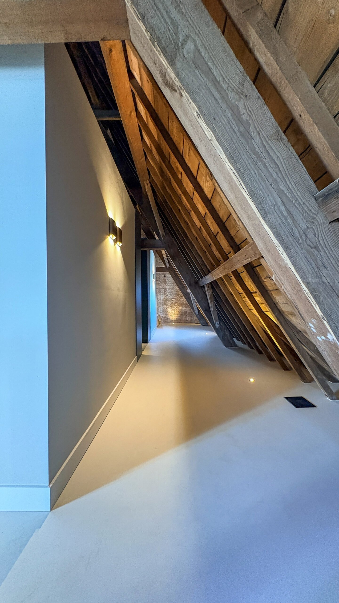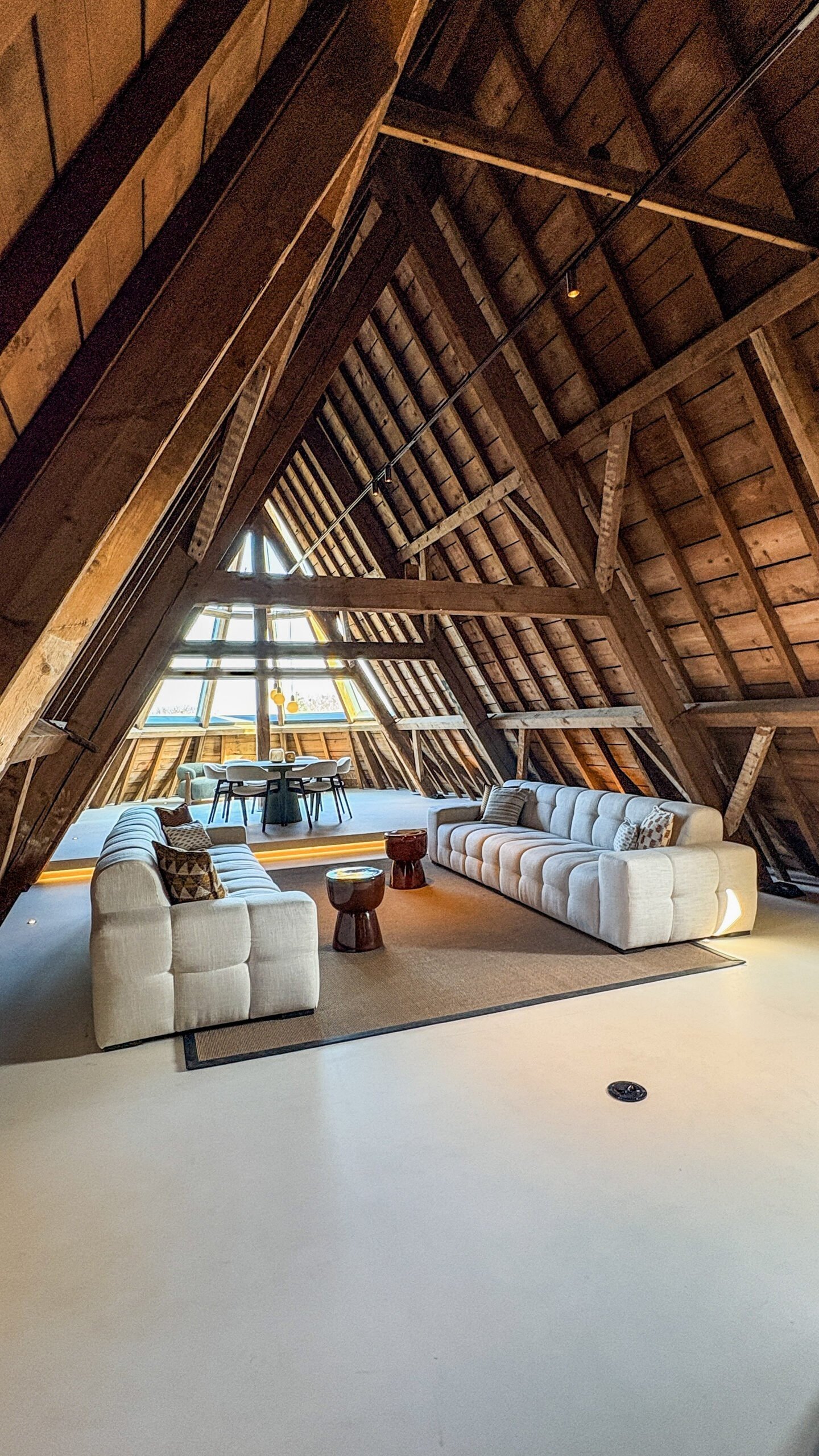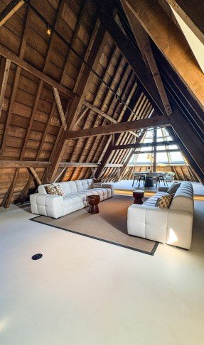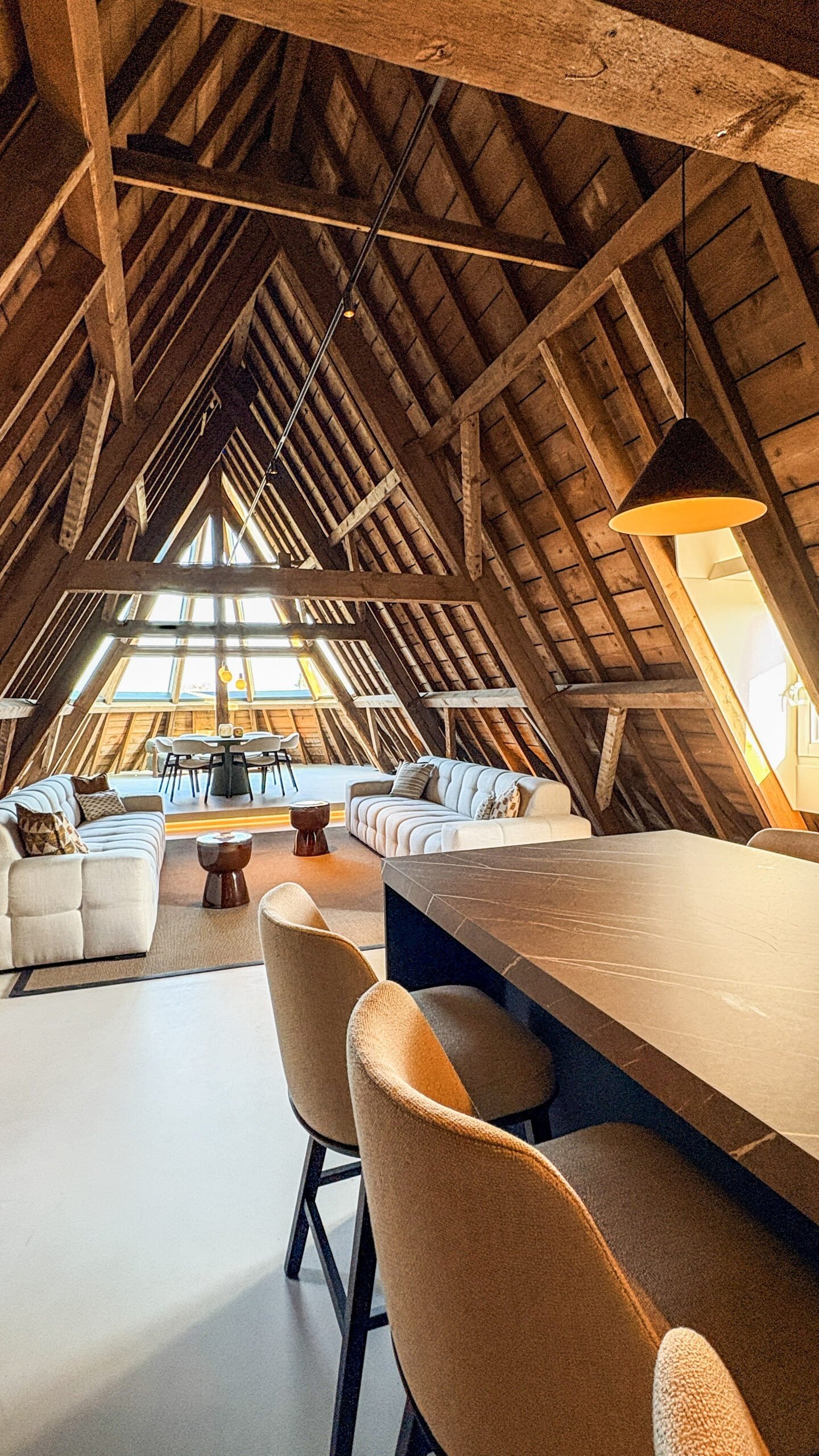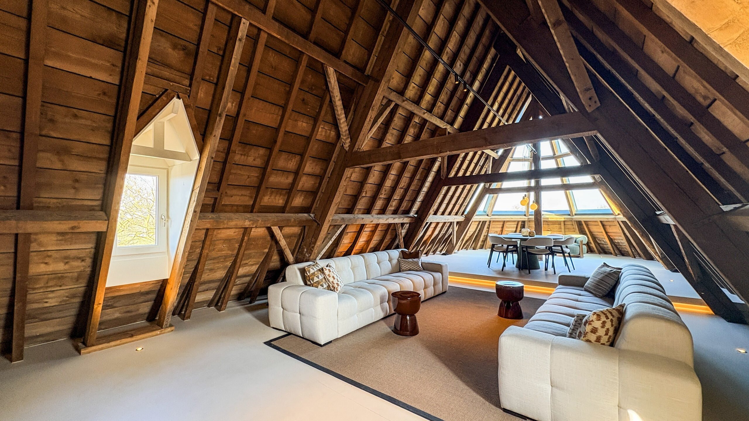 De bovenste verdieping vormt het absolute hoogtepunt. Onder het originele houten kapgebint bevindt zich een indrukwekkende leefruimte waar architectuur en modern wonen samenkomen. De zichtbare houten constructie, de hoogte en de open indeling zorgen voor een uitzonderlijke woonbeleving.