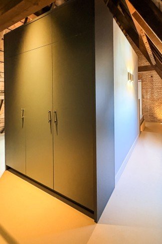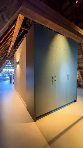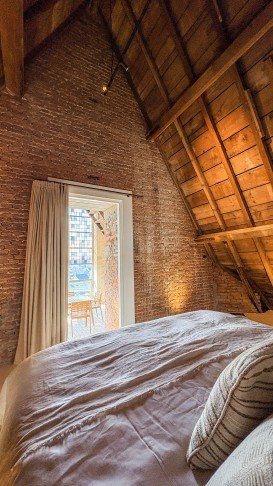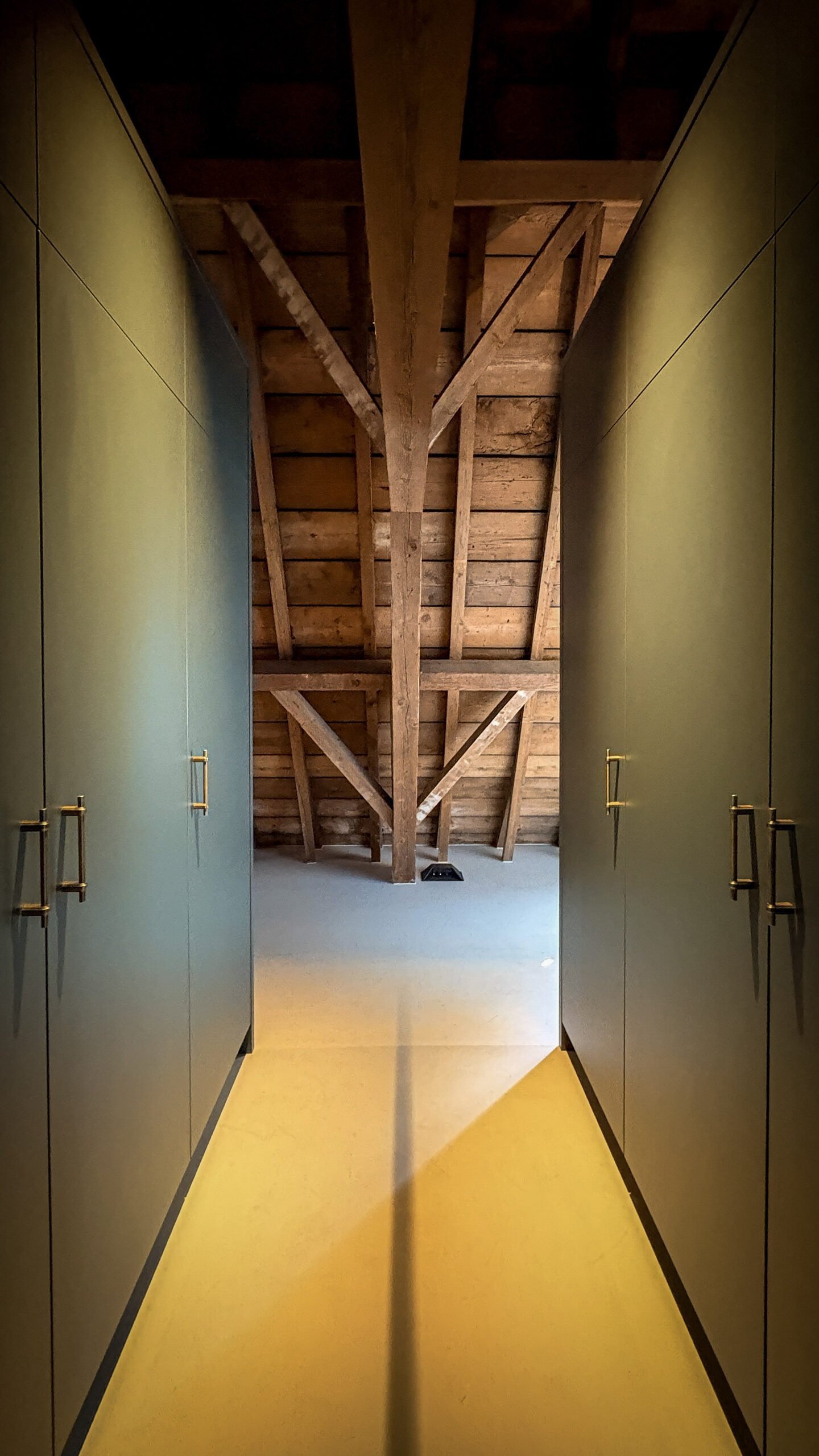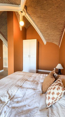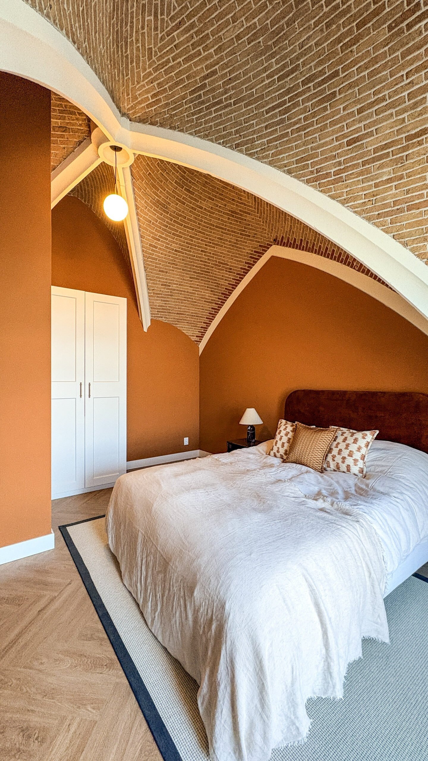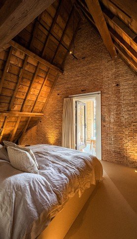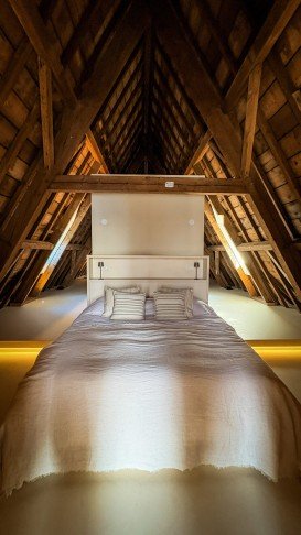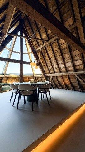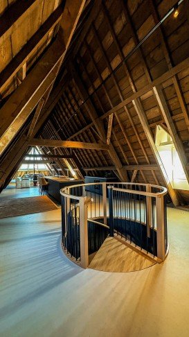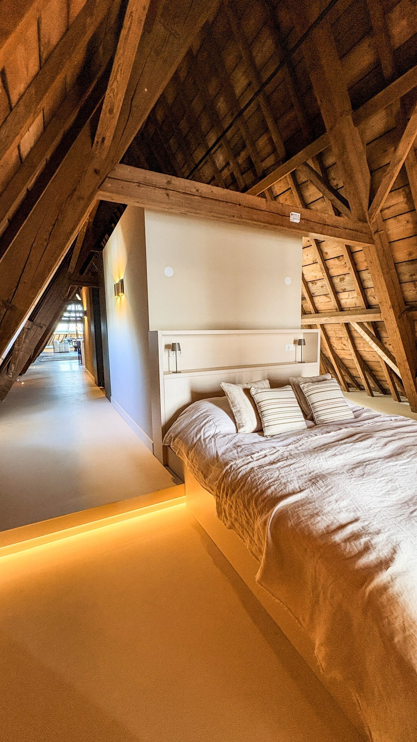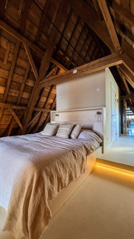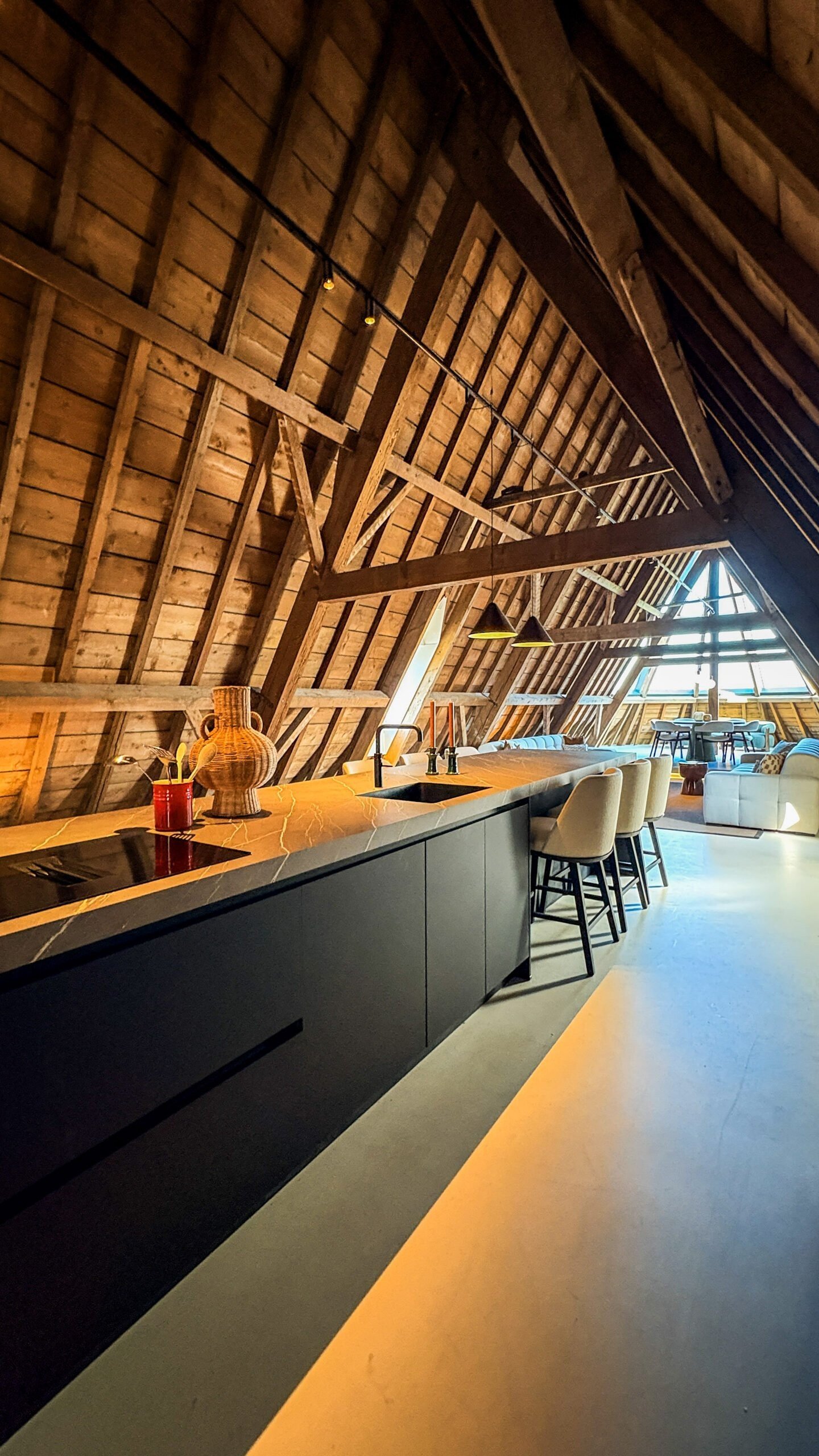 De bovenste verdieping vormt het absolute hoogtepunt. Onder het originele houten kapgebint bevindt zich een indrukwekkende leefruimte waar architectuur en modern wonen samenkomen. De zichtbare houten constructie, de hoogte en de open indeling zorgen voor een uitzonderlijke woonbeleving.