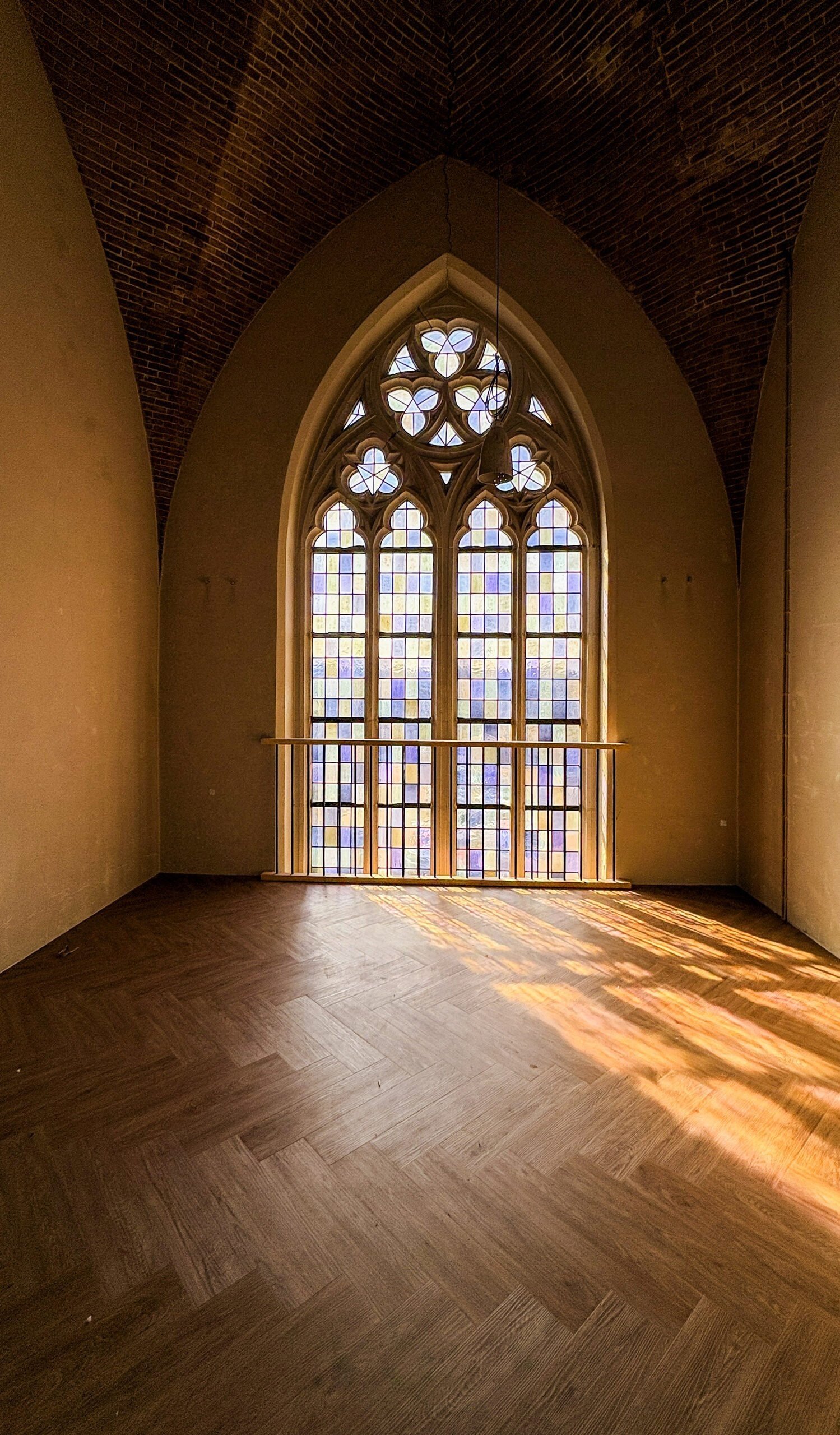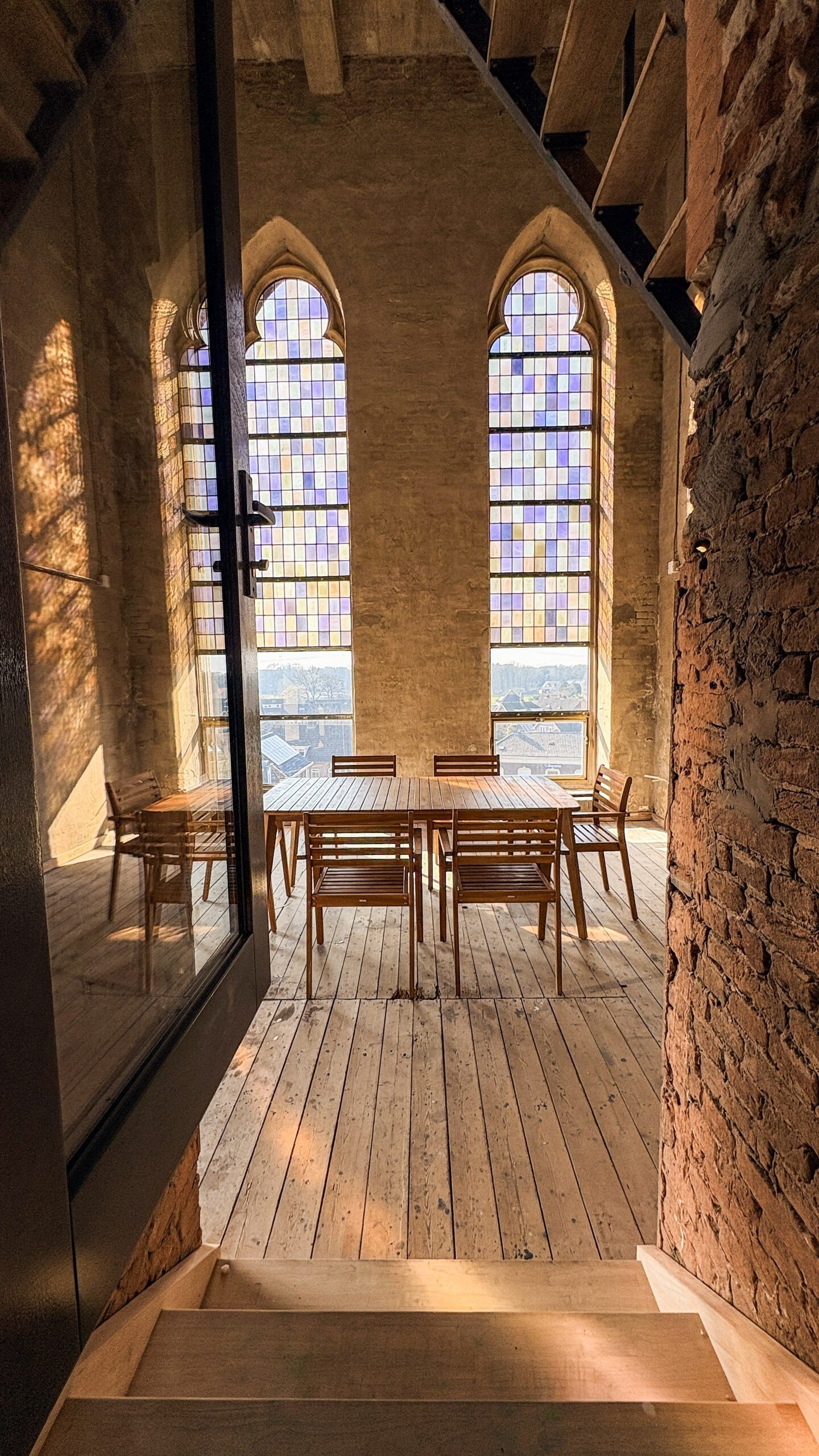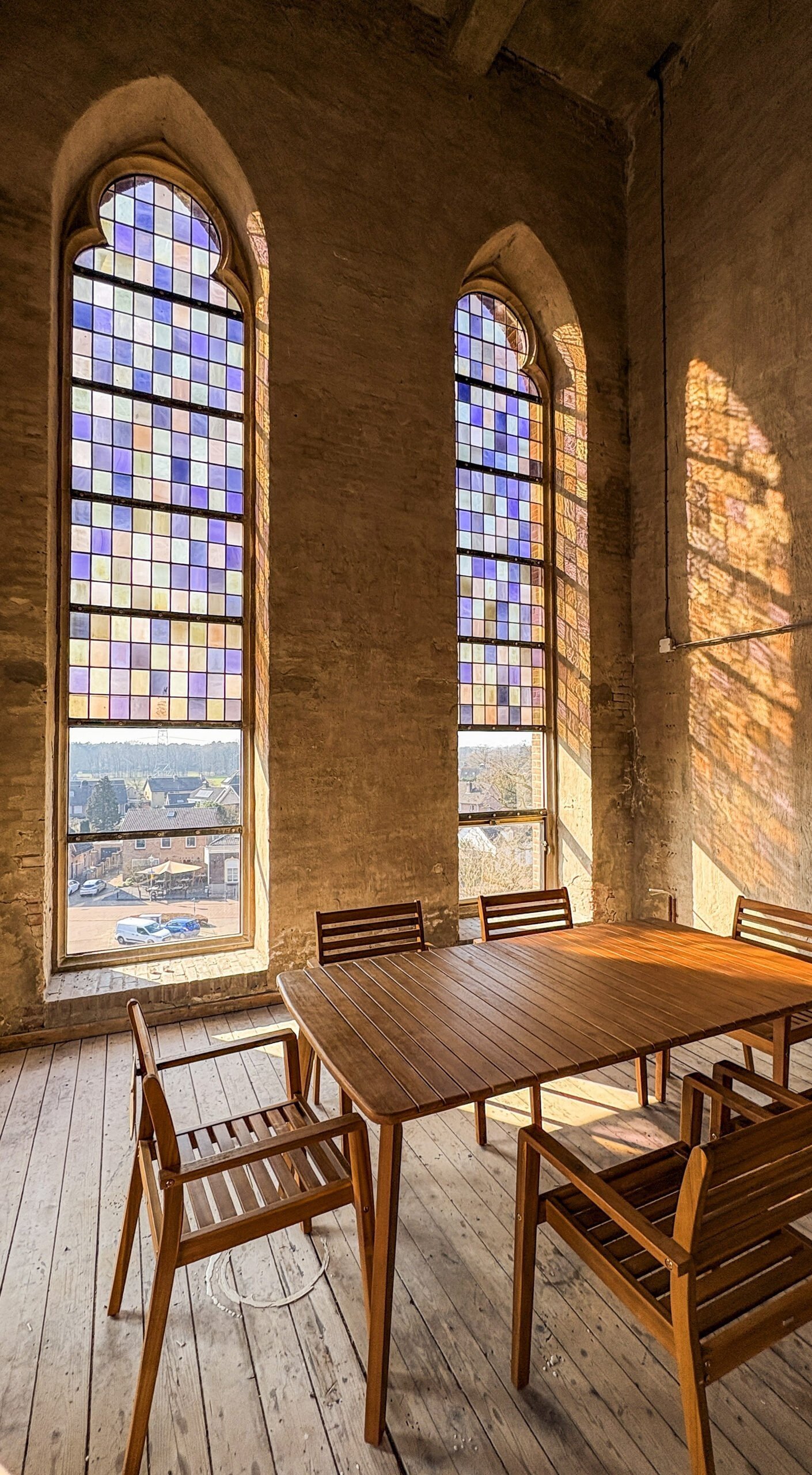 Bijzonder zijn de twee ‘buitenkamers’: unieke ruimtes hoog in de kerk, omgeven door imposante kerkramen. Hier geniet je van een spectaculair uitzicht over Eerde en de omgeving, terwijl het licht gefilterd wordt door de glas-in-loodramen. Binnen en buiten vloeien hier op een unieke manier in elkaar over.