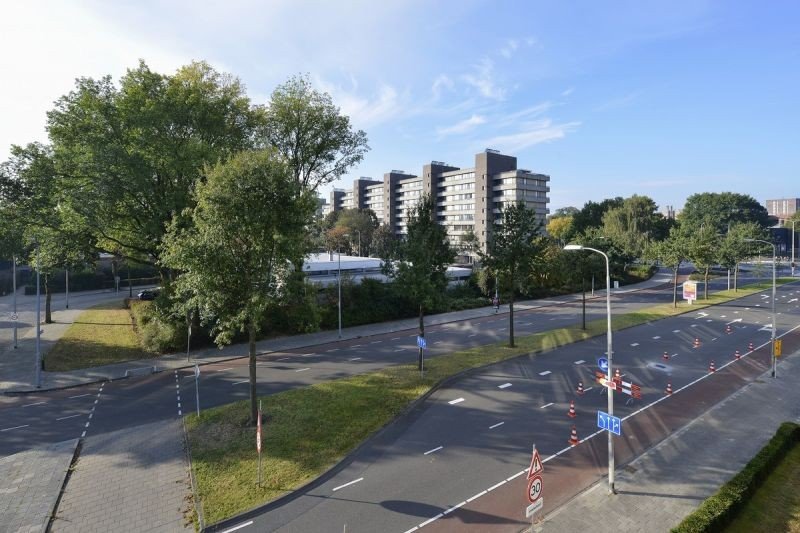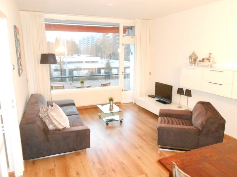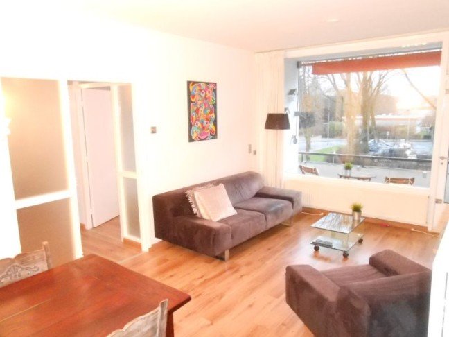 Lichte, ruime woonkamer met deur naar groot, tweede balkon, deur naar 2e slaapkamer en kledingkamer. De ruime raampartijen in de woonkamer verzorgen een prettige lichtinval en bieden een fraai zicht op de Europalaan aan de voorzijde.