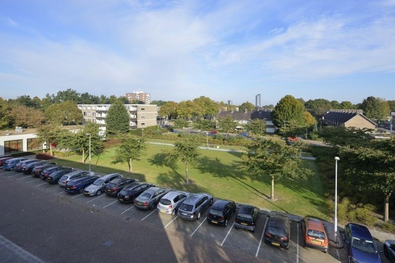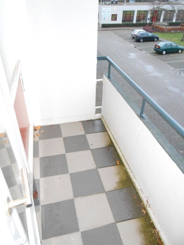 Rustig gelegen, klein, betegeld balkon aan de keukenzijde met wijds uitzicht over openbaar groen, parkeerplaats en de omgeving.