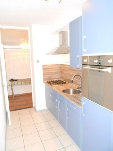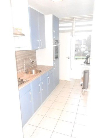 Dichte keuken voorzien van tegelvloer en keukeninstallatie in wandopstelling met diverse onder- en bovenkasten, laden, 4-pits gaskookplaat, afzuigkap, rvs spoelbak, koelkast en oven. In de bijkeuken is de opstelling van de cv combiketel en staan de wasmachine en droger. Vanuit keuken toegang tot balkon I.