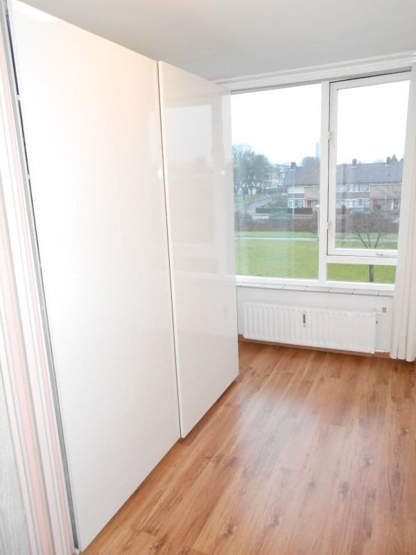 Slaapkamer II: lichte slaapkamer aan de achterzijde gelegen. Hier staat nu een hele grote kast. Die kan eventueel weggehaald worden.