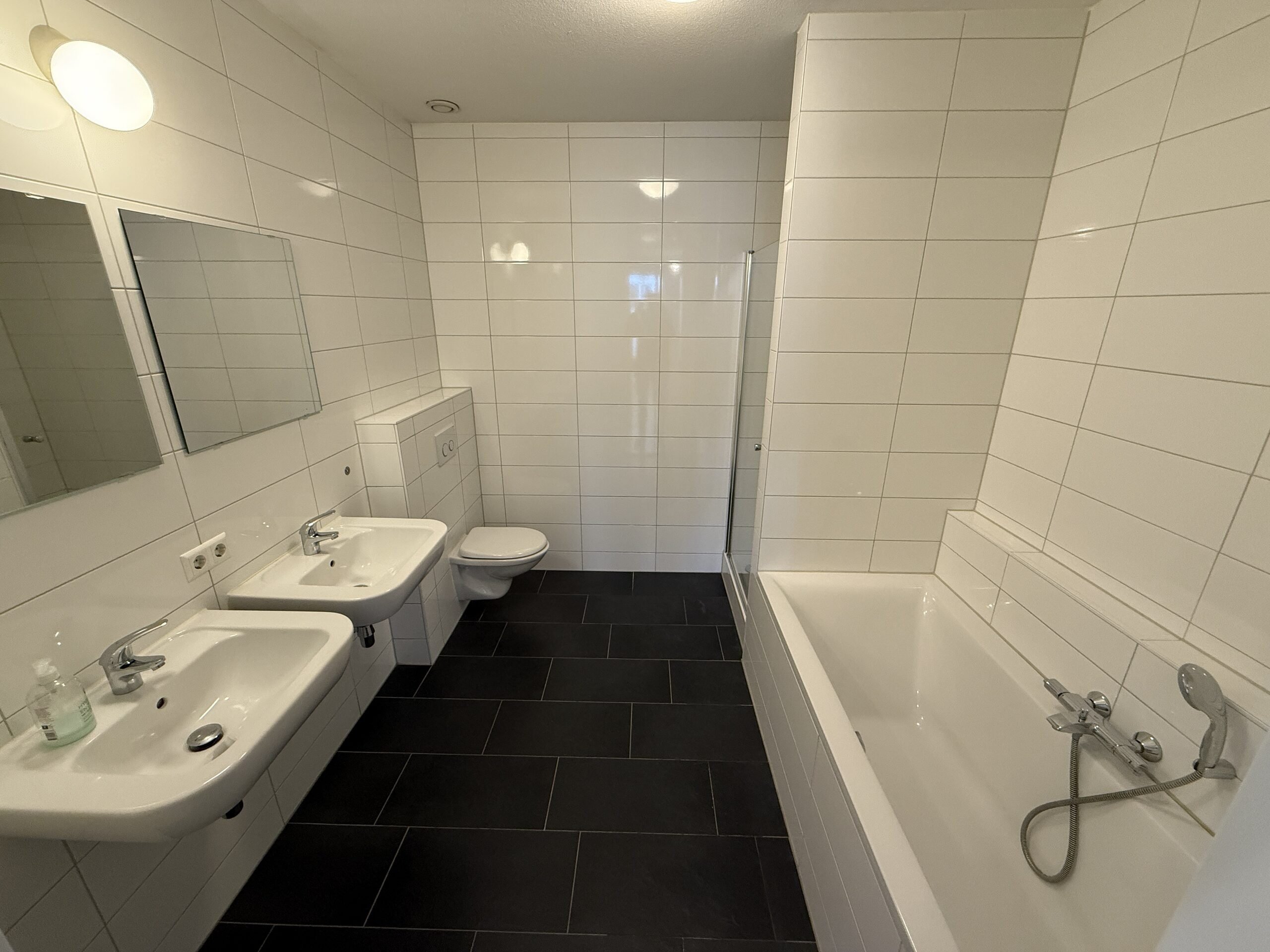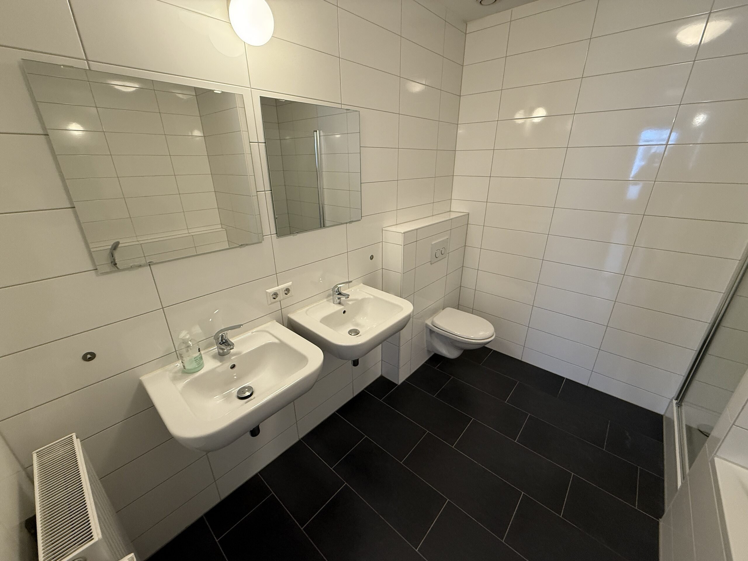 - Badkamer en suite met douche, dubbele wastafel, ligbad en toilet