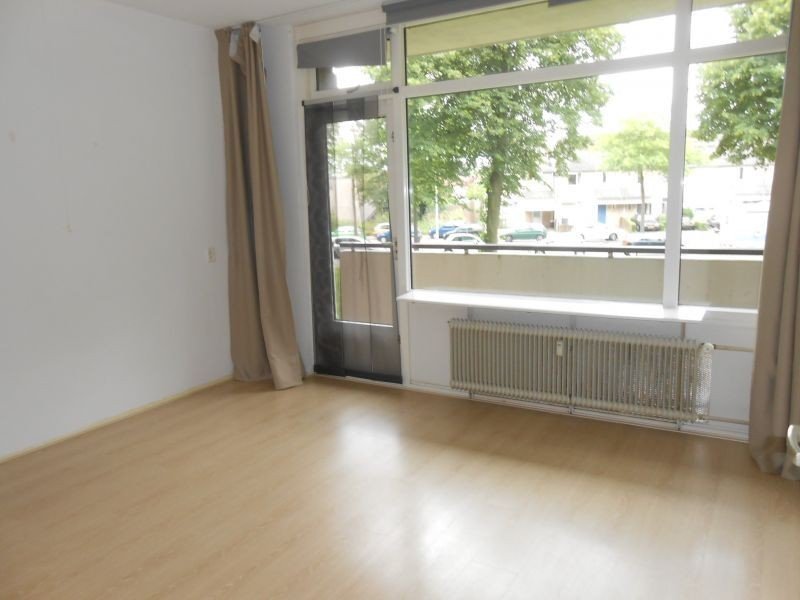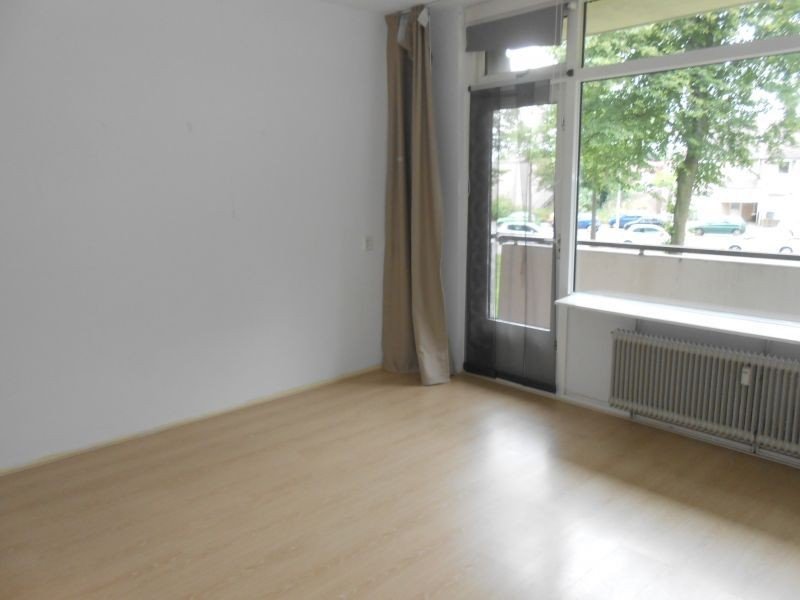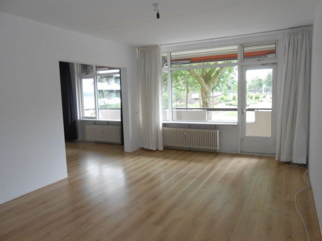 Royale woonkamer(± 35 m²) met fraaie laminaatvloer en toegang tot balkon over de volle breedte aan de voorzijde (op de zonzijde gelegen), de woonkamer is opgesplitst in een zit- en eetgedeelte en geniet veel lichtinval door de grote raampartijen.