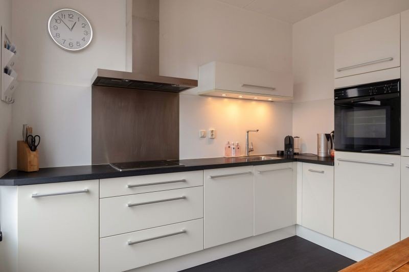 Ruime en half open woonkeuken voorzien van een spoelbak, keramische kookplaat, afzuigkap, oven, koelkast, vrieskast en vaatwasser
