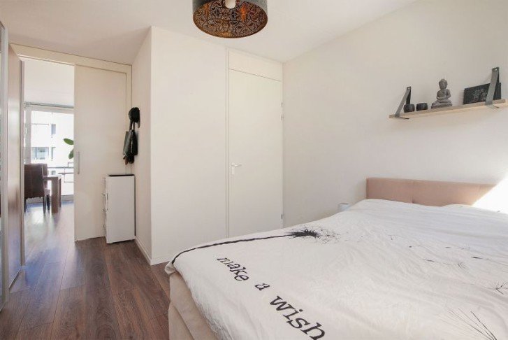 Entree/hal met laminaatvloer voorzien van vloerverwarming, stucwerk wanden en meterkast (6 groepen, 2 aardlekschakelaars en glasvezel). Toilet met tegelvloer, betegelde wanden, hangcloset, fonteintje en afzuiging. Inbouwkast met opstelling cv-combiketel (Ferroli, bouwjaar 2011) en WTW-installatie. Inbouwkast met wasmachine-aansluiting. Open keuken met luxe inrichting in rechte opstelling voorzien van koelkast, gaskookplaat, oven, afzuigkap en vaatwasser. Lichte woonkamer met laminaatvloer voorzien van vloerverwarming en stucwerk wanden. Schuifpui naar overdekt balkon gelegen op het westen. Slaapkamer met laminaatvloer en stucwerk wanden. Geheel betegelde badkamer met wastafel, extra brede douche en afzuiging.