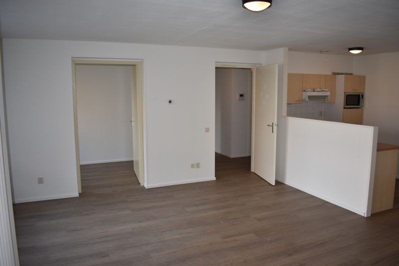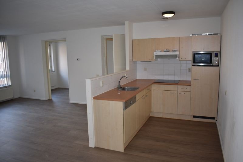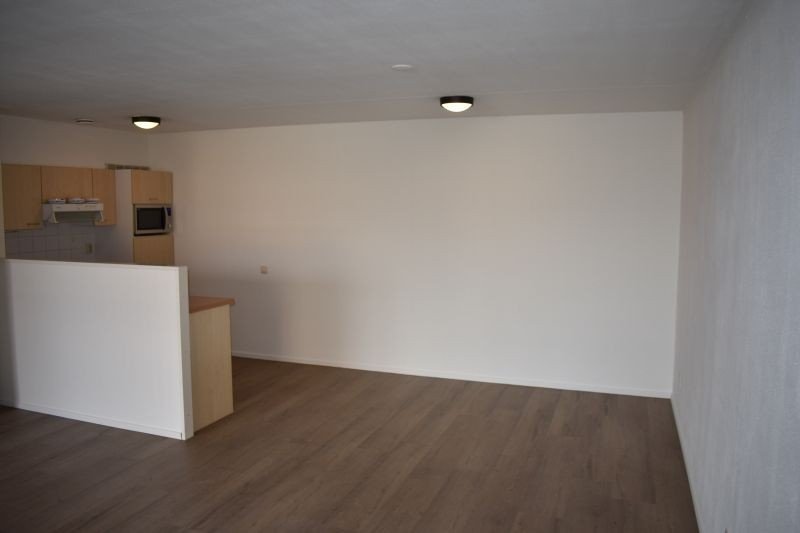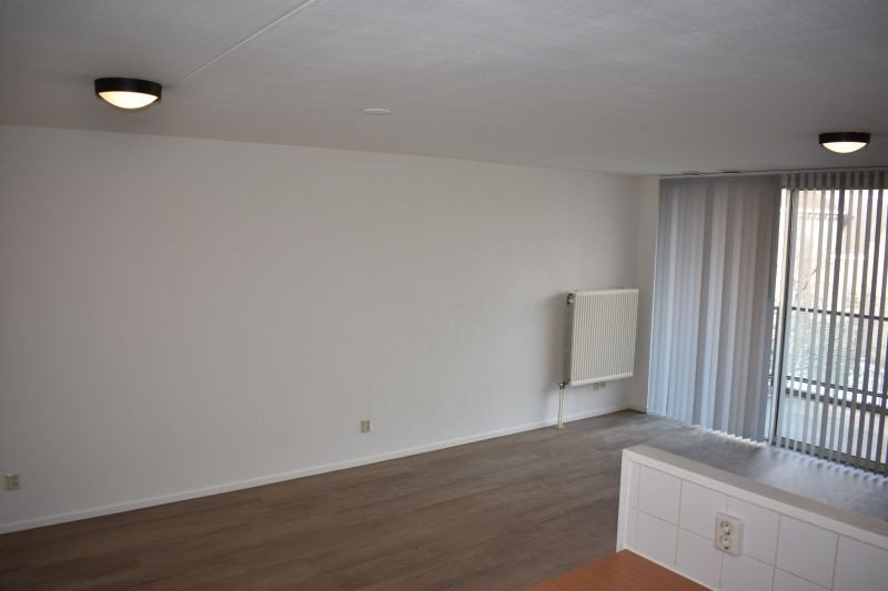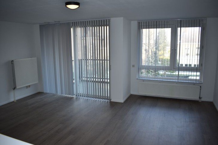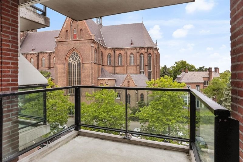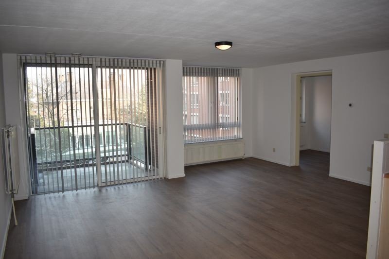 Ruime woonkamer met fijne lichtinval en via schuifpui toegang tot het balkon met uitzicht op de kerk.