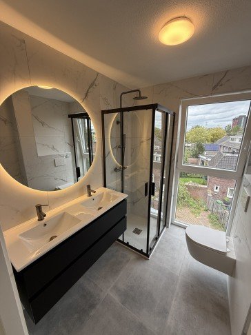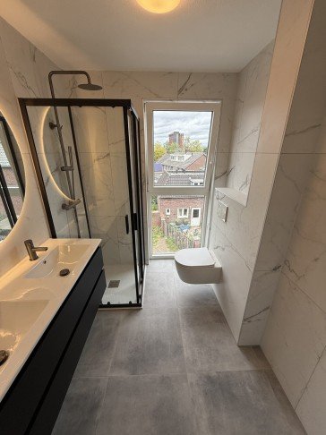 The bedroom is spacious and light, and the bathroom is luxuriously finished with marble look tiles, a walk-in shower, and a double sink. Additionally, the bathroom is equipped with a washing machine and dryer.