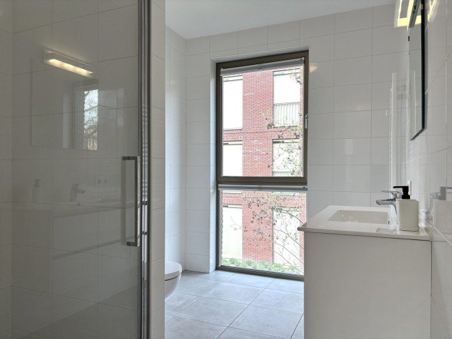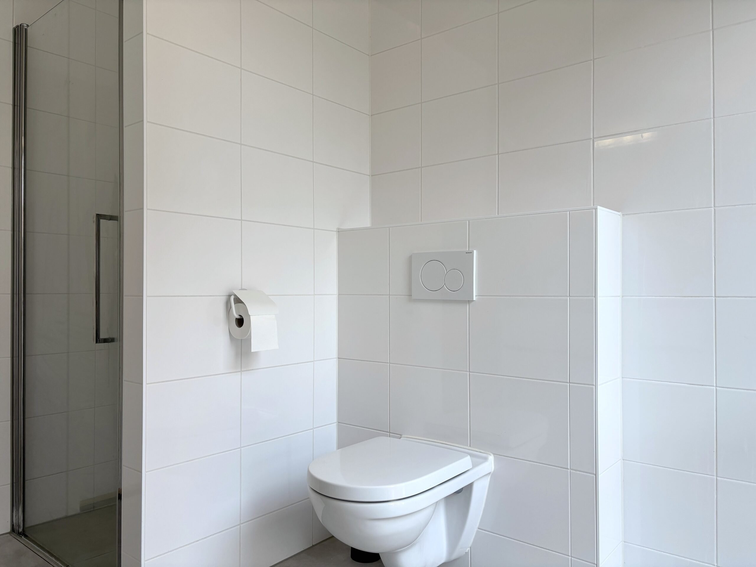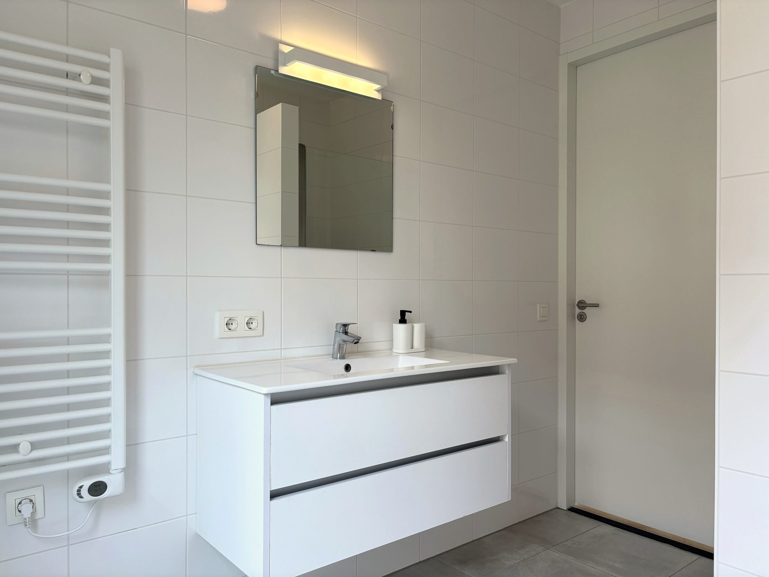 De badkamer is voorzien van een ruime inloopdouche, toilet en een wastafel met meubel.