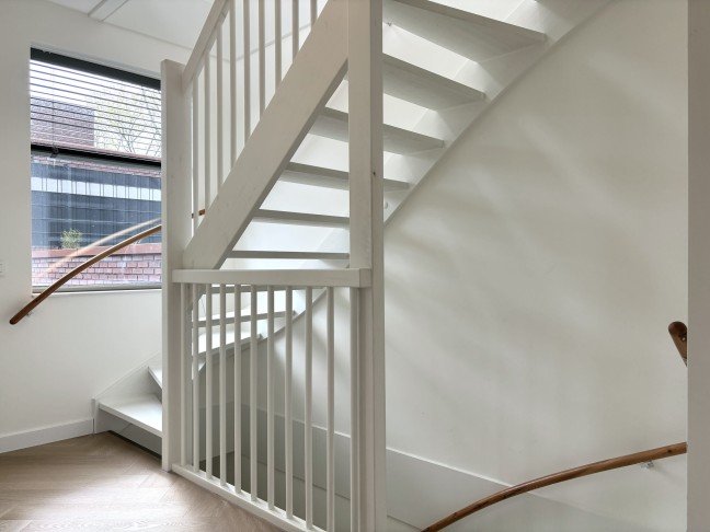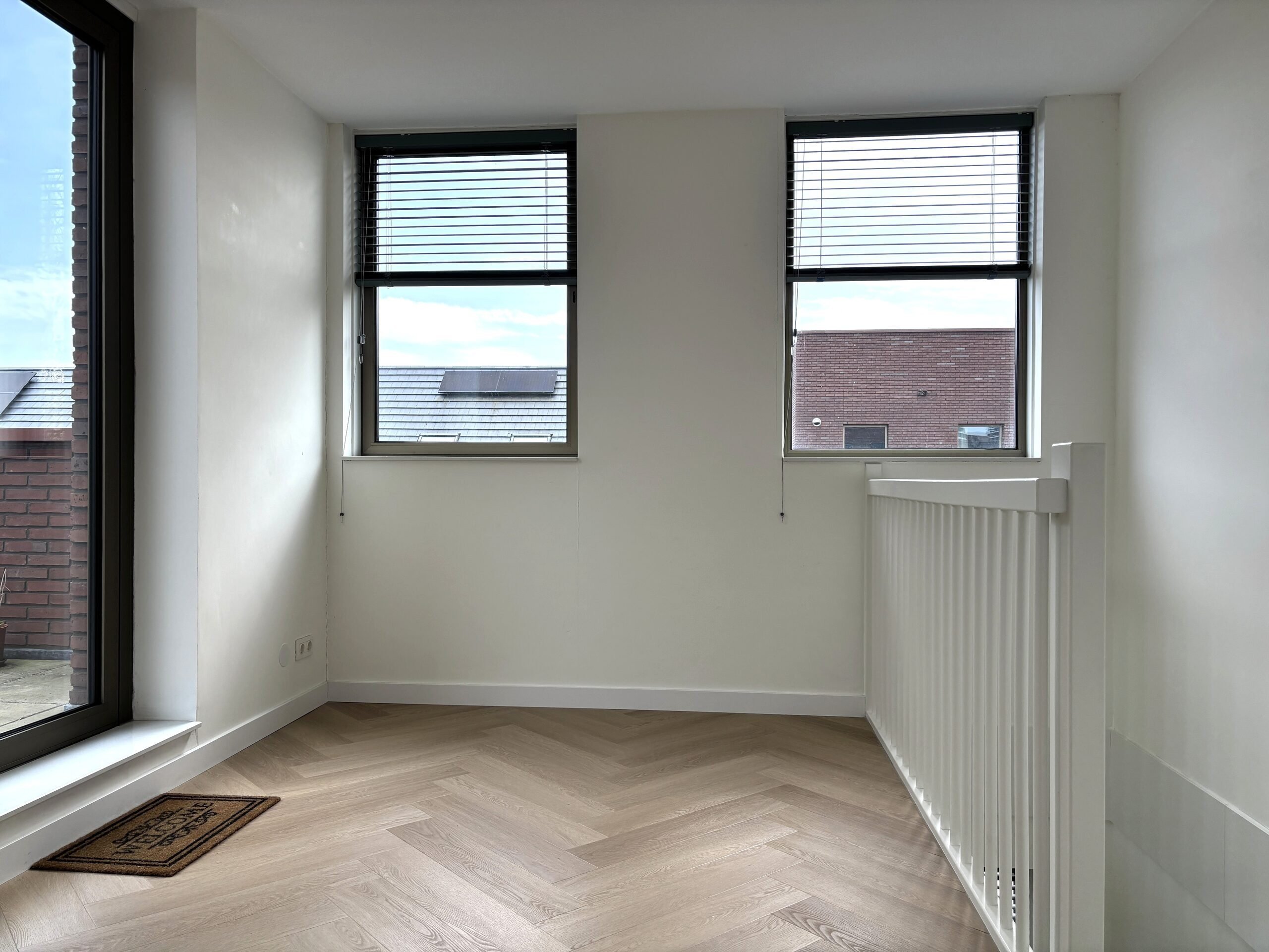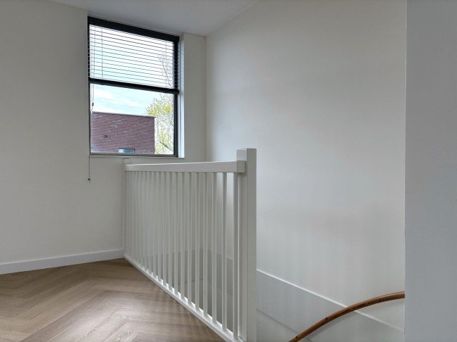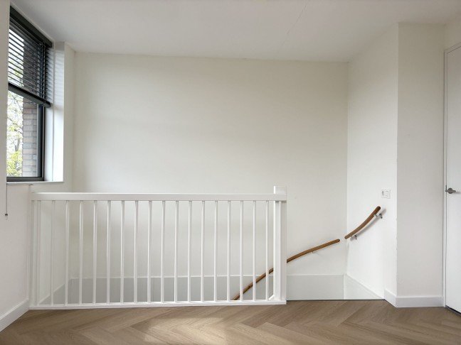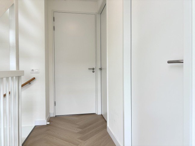 Overloop met toegang tot twee slaapkamers. De hoofdslaapkamer bevindt zich aan de voorzijde van de woning, terwijl de tweede slaapkamer aan de achterzijde is gesitueerd.