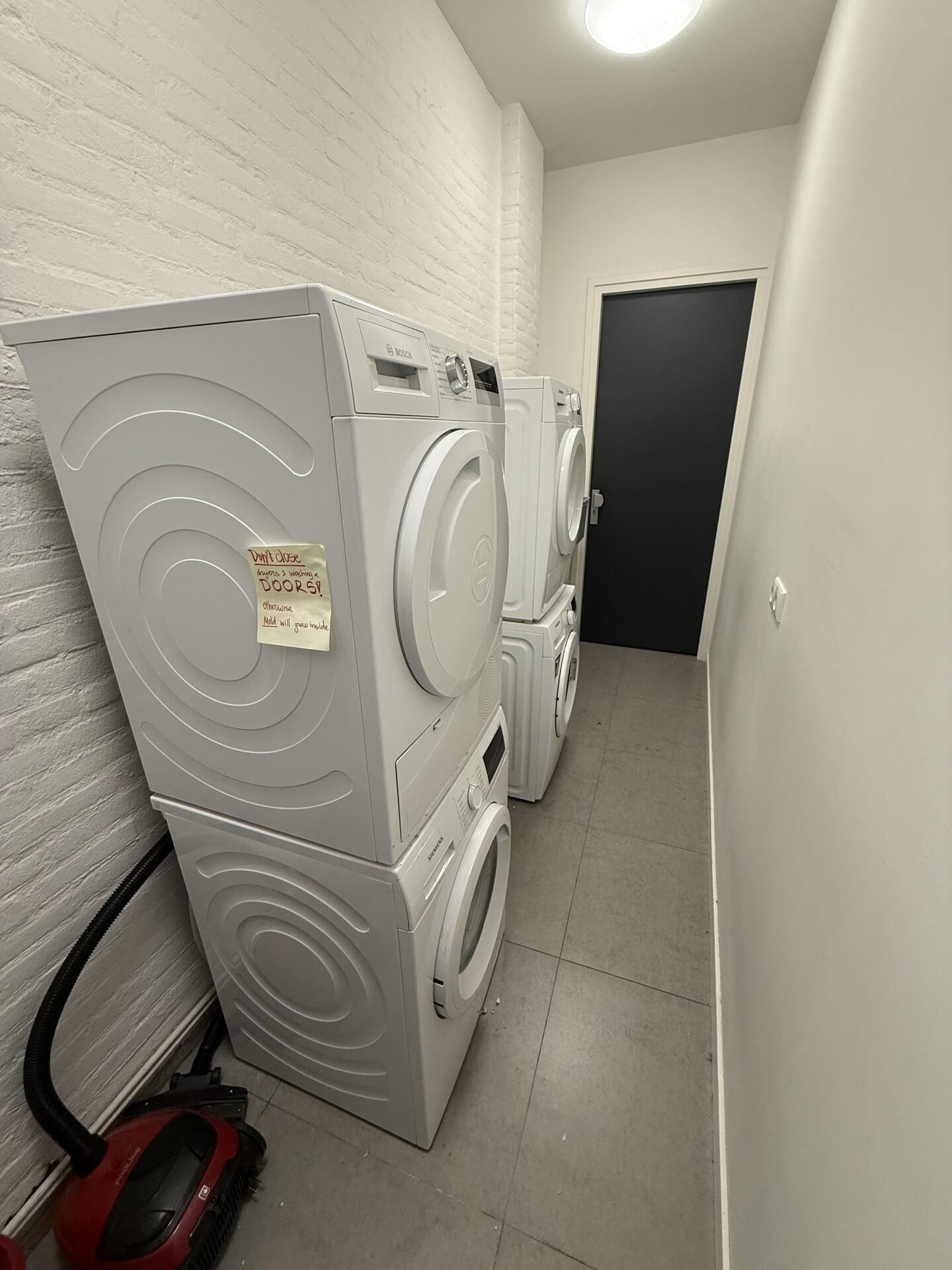 Binnenkomst in centrale gang, met trapopgang naar de 1e verdieping en toegang tot de studio’s op de begane grond. Aan het einde van de gang bevindt zich de wasruimte met wasmachines en drogers.