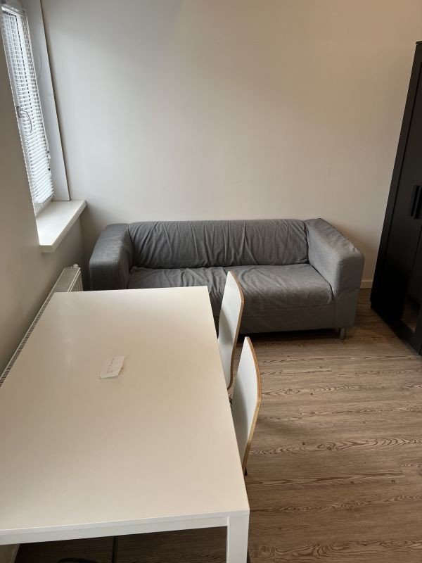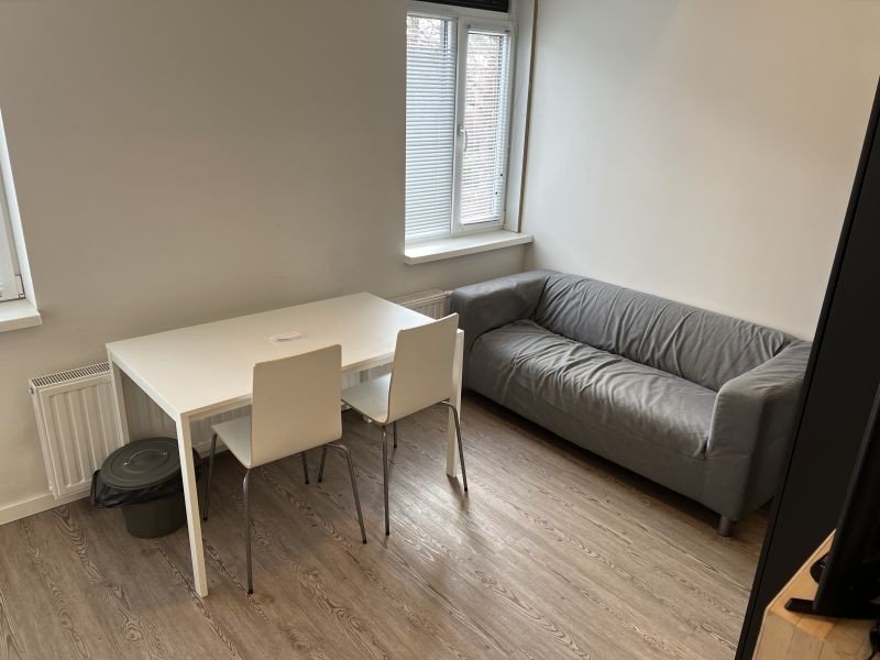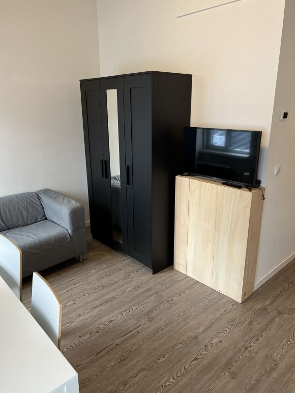 De studio is volledig gemeubileerd en is voorzien van 1-persoonsbed, kledingkast, bank met salontafel, TV meubel met flat screen TV, lamp en eettafel met 2 stoelen.