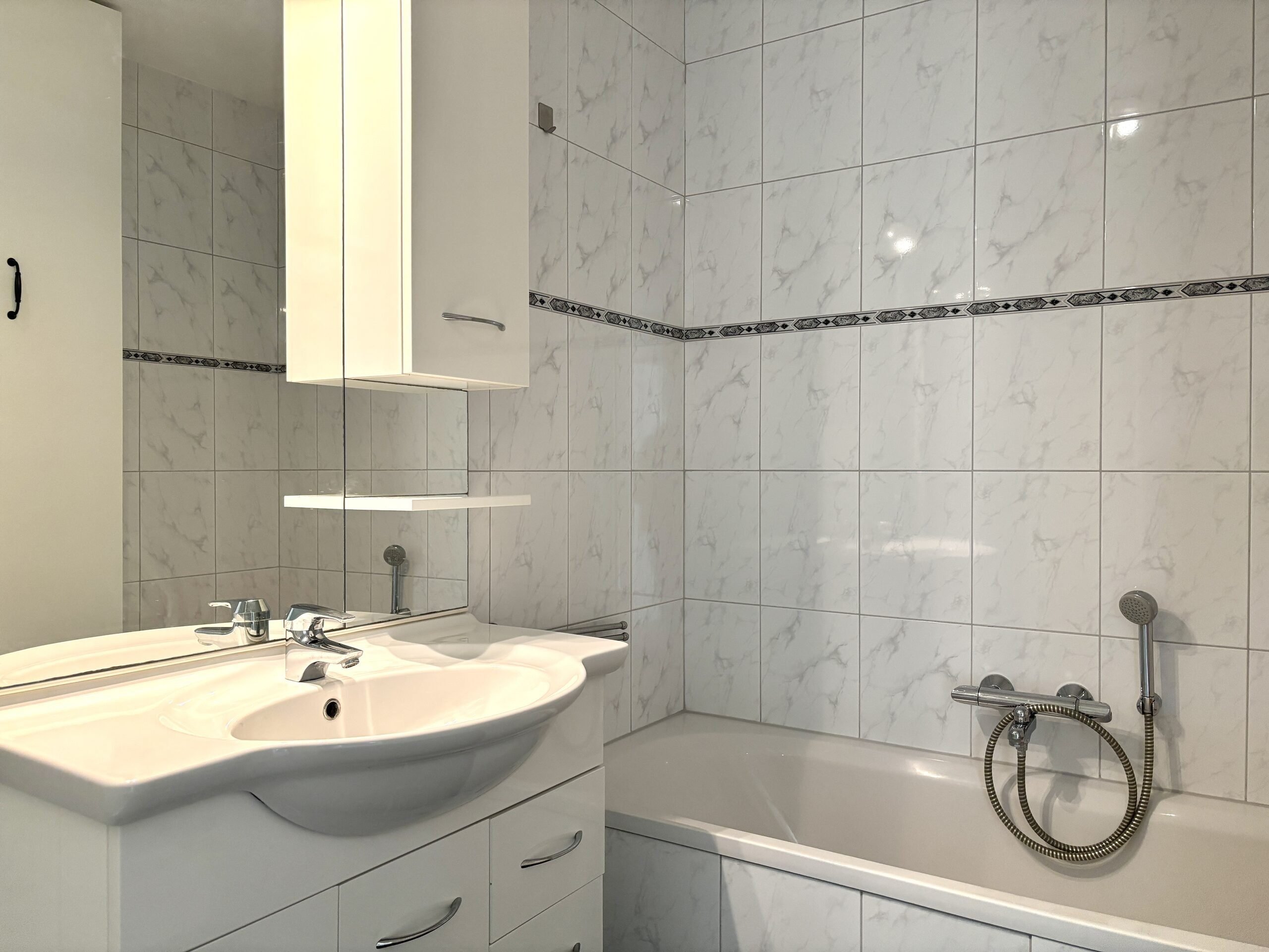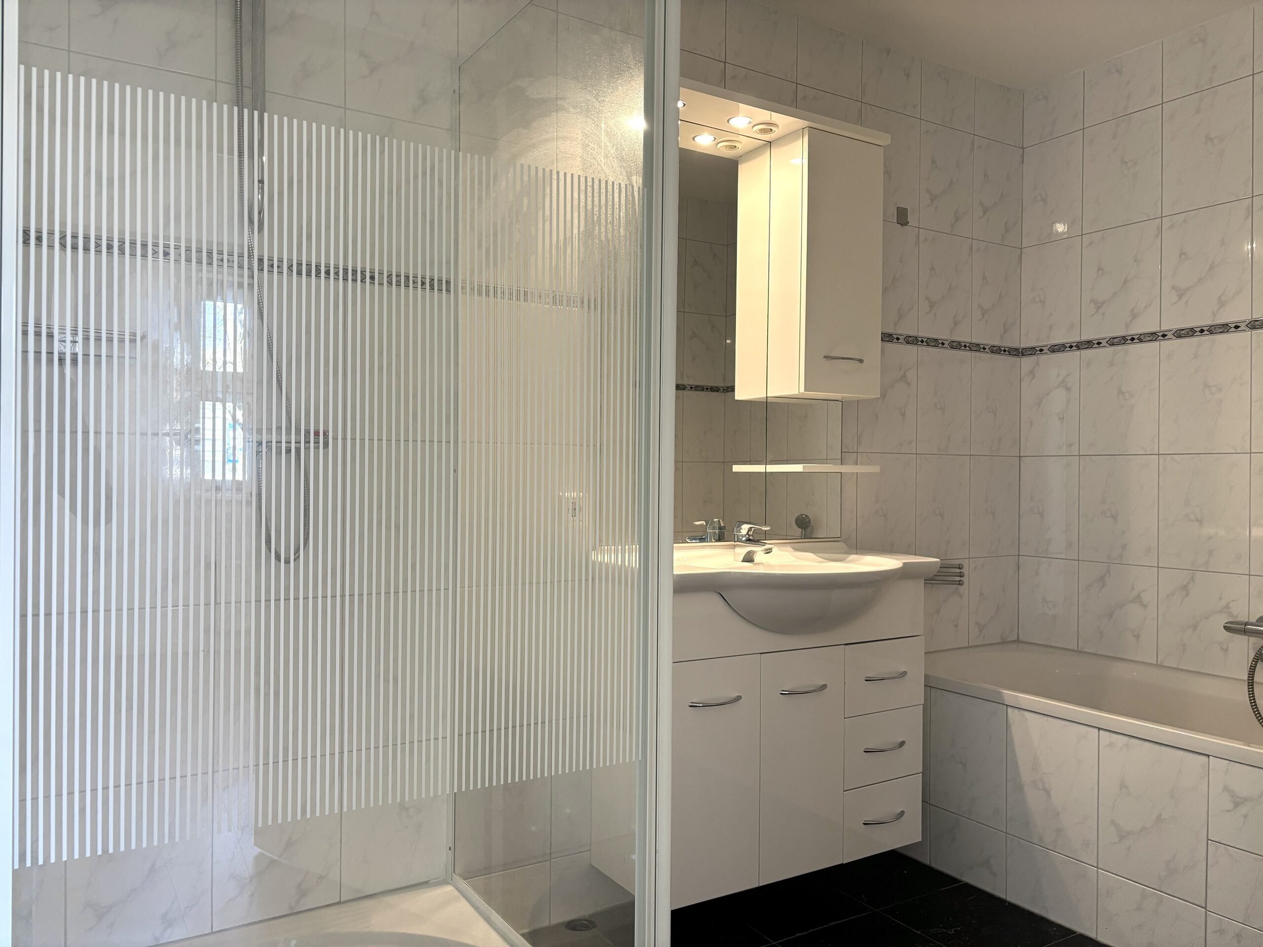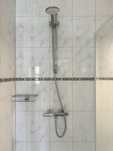 Badkamer: ruime volledig betegelde badkamer voorzien van een douchecabine, ligbad, wastafel met wastafelmeubel.