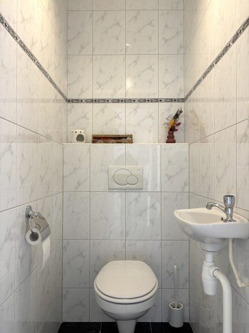 Toilet: volledig betegeld toilet met klein wastafel.
